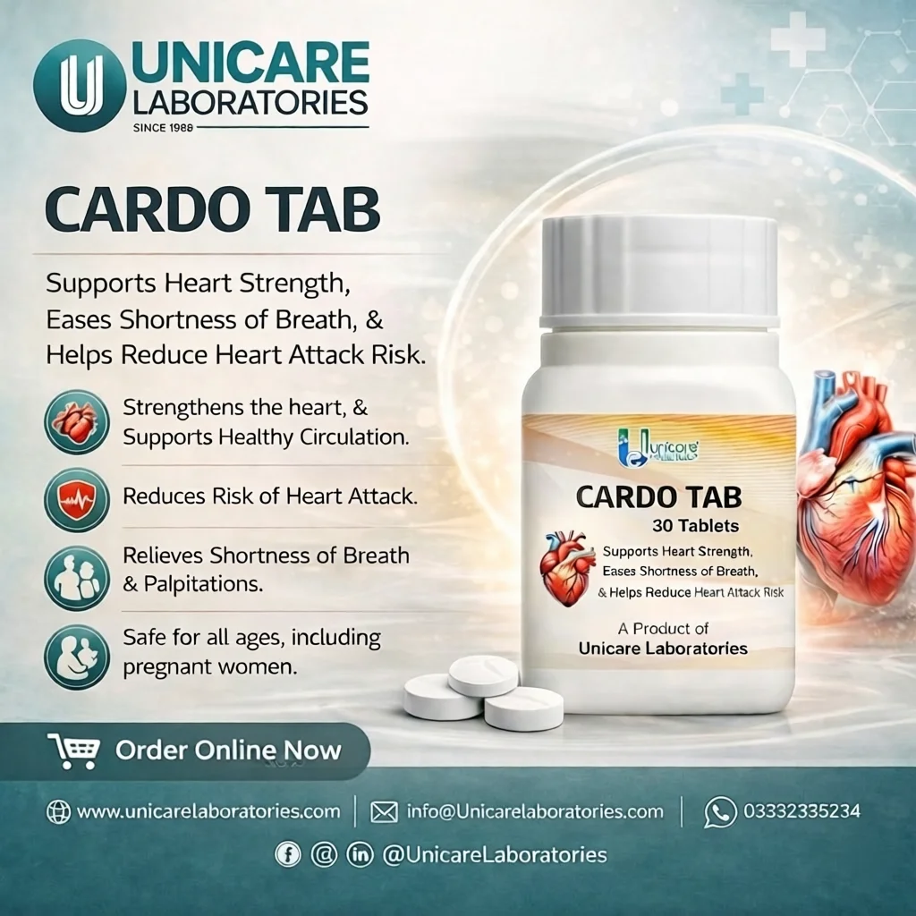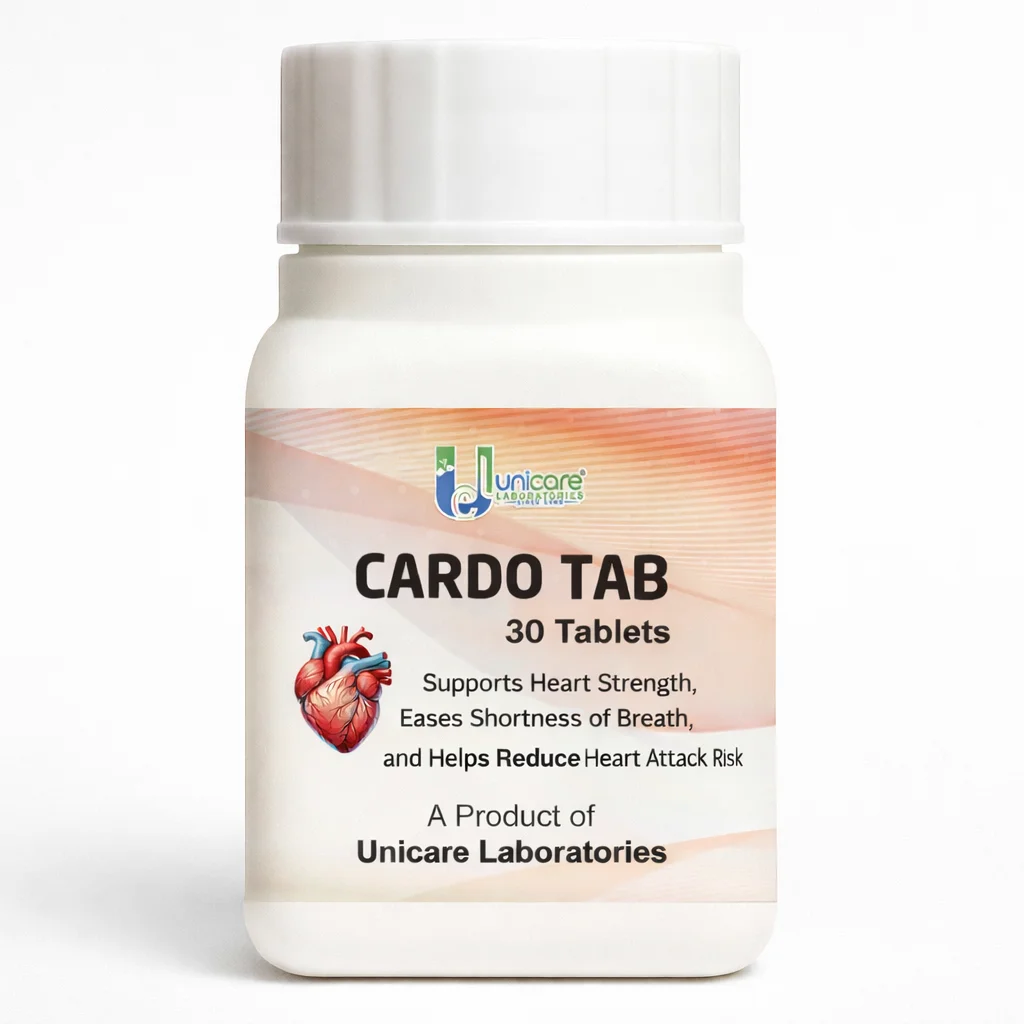 Cardo Tab by Unicare Laboratories is a natural heart health formula that supports cardiovascular function, strengthens the heart muscle, and promotes healthy blood circulation. It is especially effective in relieving shortness of breath, rapid heartbeat, and palpitations, while also helping reduce the risk of heart attack.