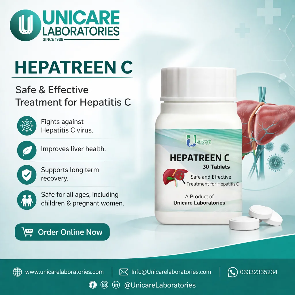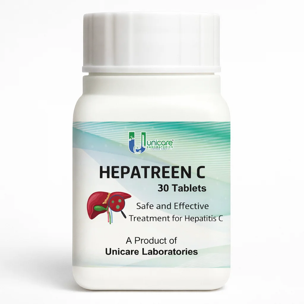 Hepatreen C by Unicare Laboratories is a natural, gentle yet powerful remedy that helps the body combat Hepatitis C virus (HCV), support liver function, and promote complete recovery. Regular use of Hepatreen C has been associated with negative PCR results in patients, and it also helps prevent recurrence after recovery.